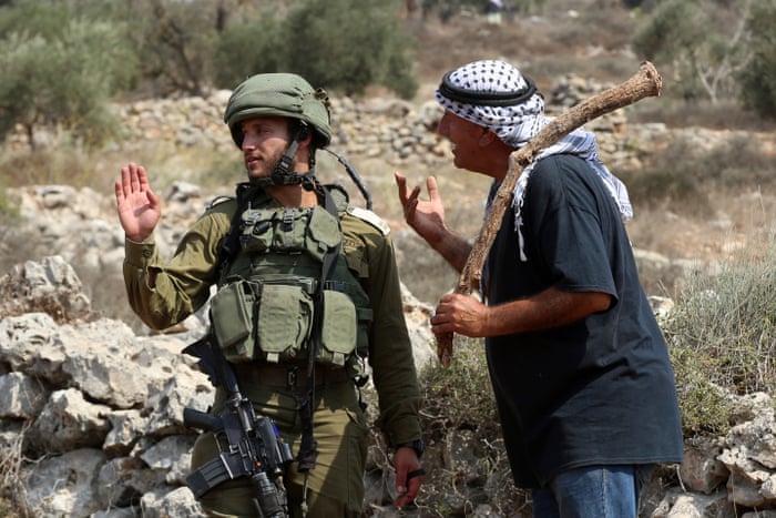 An Israeli soldier with a Palestinian farmer who is waiting to reach a farm to harvest olives, in Yetma, the West Bank. (Alaa Badarneh/EPA)